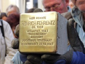 Gunter Demnig verlegte gestern den ersten Stolperstein vor dem Haus Dreikönigstraße 15. Er soll an Heinrich Fehrentz erinnern, der hier bis 1943 lebte. Er wurde im Dezember 1943 hingerichtet, weil er einer antinazistisch eingestellten Kegelgruppe angehörte.
